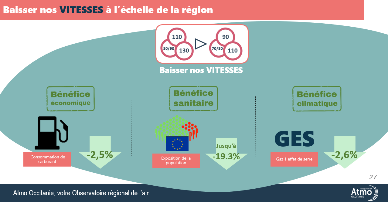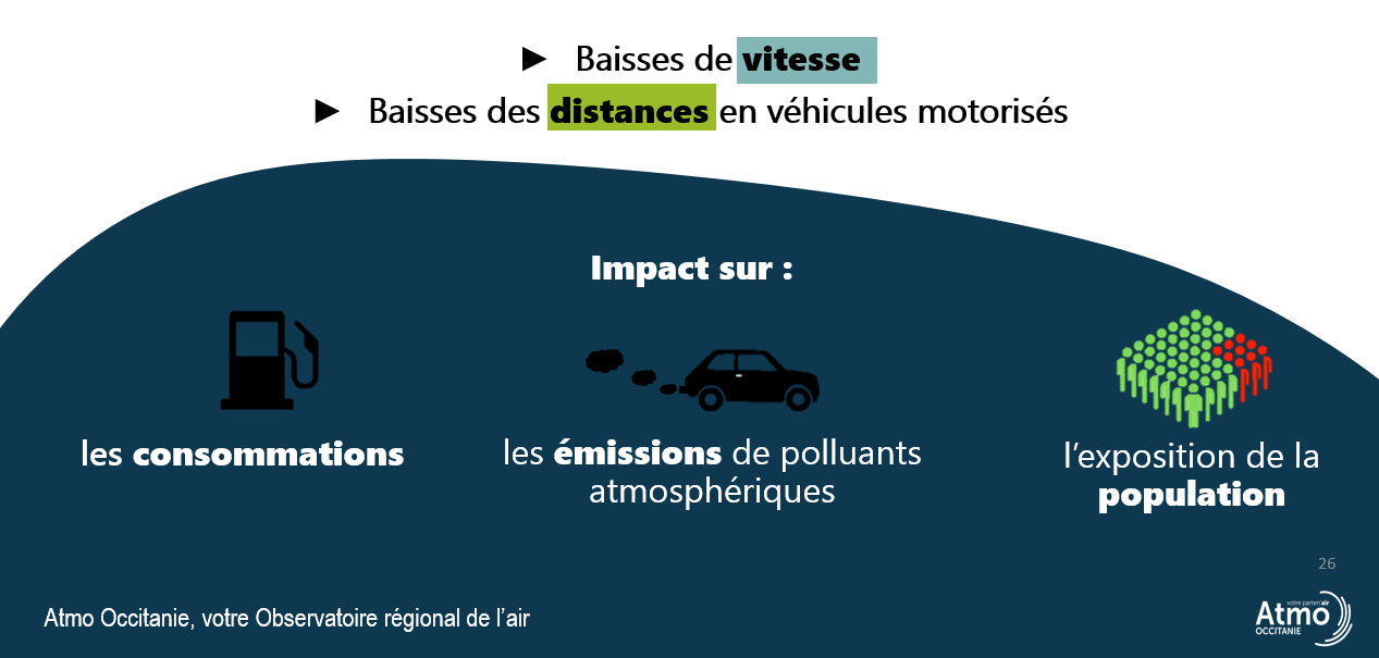 Atmo Occitanie a évalué deux leviers, la baisse des vitesses et la réduction des déplacements motorisés, pour mesurer leurs effets sur la consommation d’énergie, les émissions de polluants atmosphériques et l’exposition des habitants à la pollution.